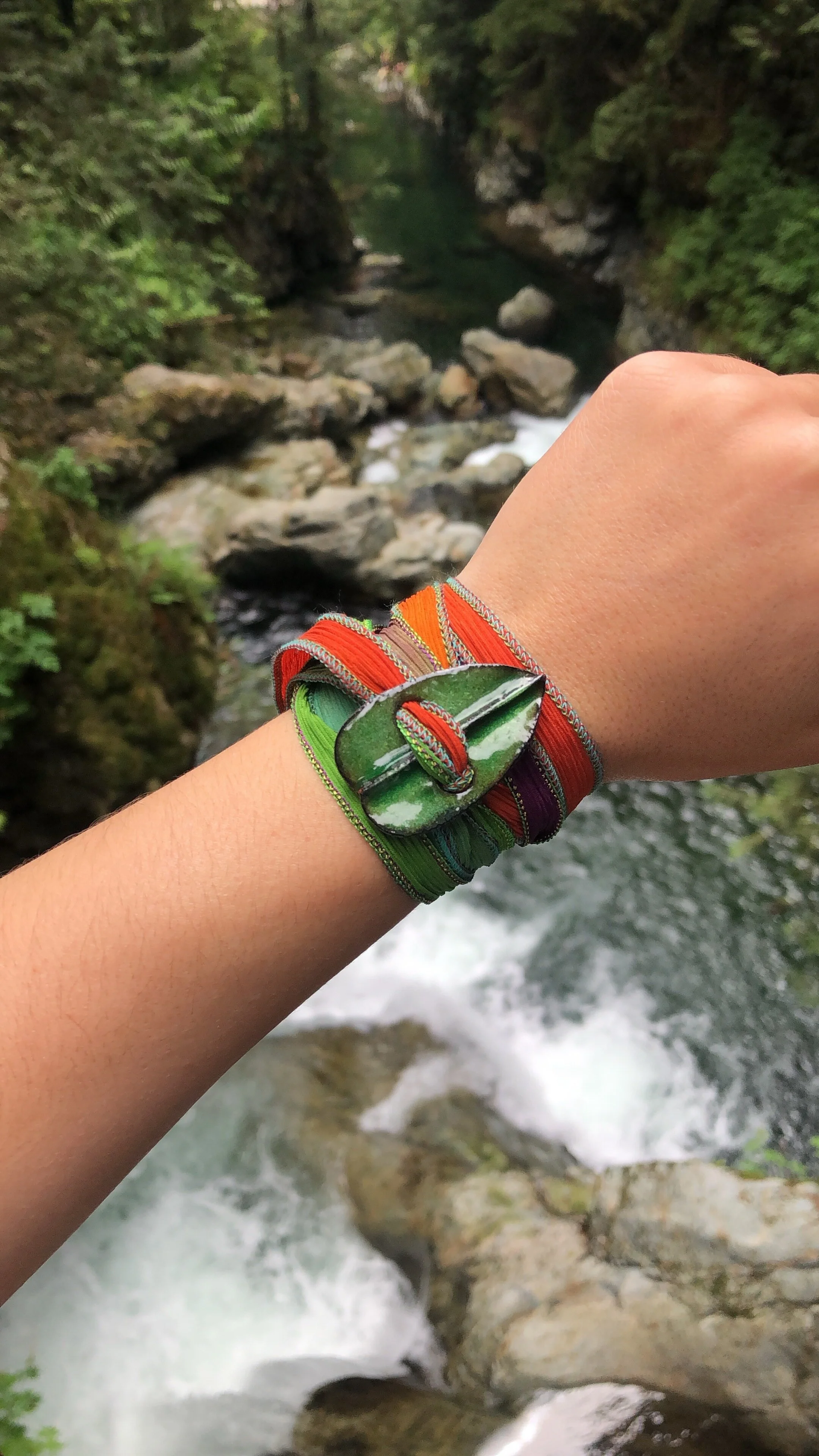Dyeing silk is exploring color combinations and blending colors together similar to watercolor painting. After the silk has been through the dyeing process, each ribbon is individually sewn with contrasting threads. The unique button clasps are made by either enamel applied on copper and fired in a kiln or etched and textured metals with patina and sealer. These beautiful boho bracelets are a combination of two ribbons and a button creating a comfortable, stylish jewelry statement.